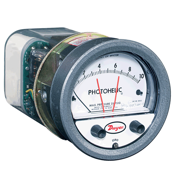 Les indicateurs / contrôleurs de pression PHOTOHELIC des séries A3000 combinent les fonctions de 2 pressostats différentiels précis et hautement reproductibles avec celles d’un indicateur / manometre de pression analogique éprouvé et à longue durée de vie de conception Magnehelic. Le Photohelic possède 2 contacts.